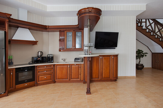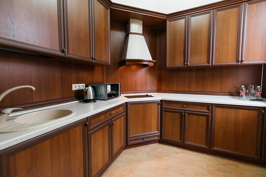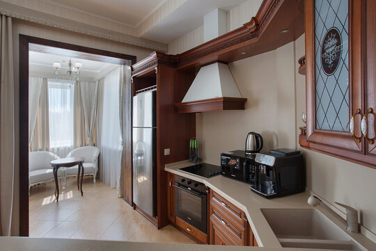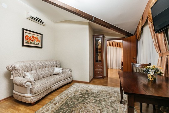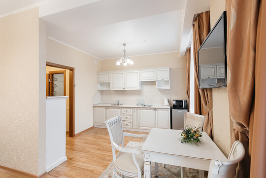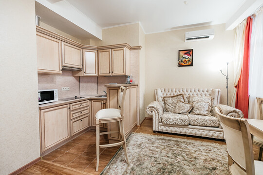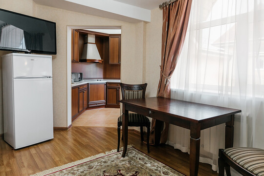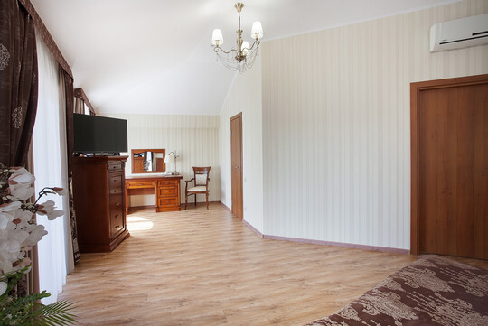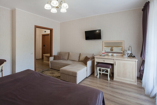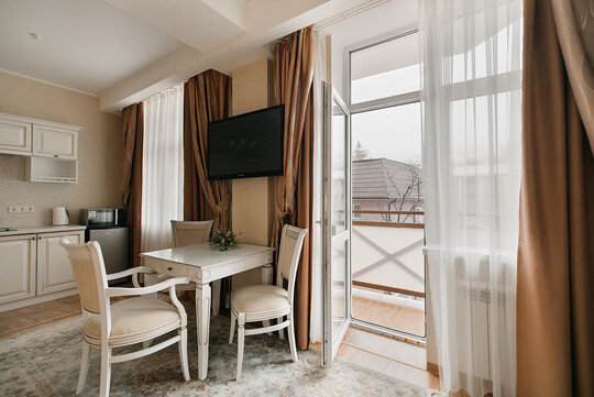 Для тех, кто не привык отказывать себе в комфорте. Гостиная с мягкой мебелью и обеденным столом. Кухонный уголок с оборудованием. Два номера данной категории, на втором этаже, имеют панорамные эркерные зоны для чаепития.